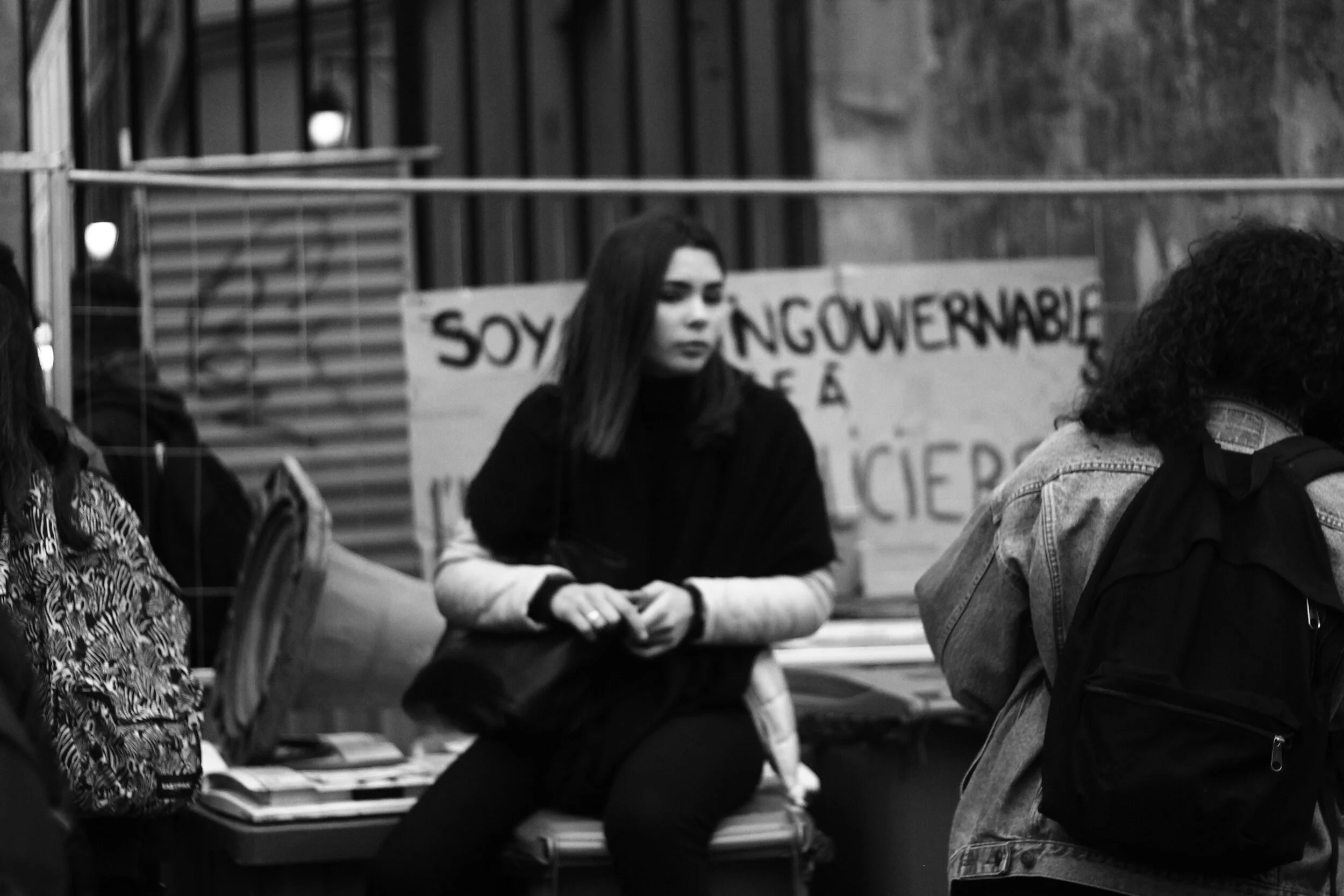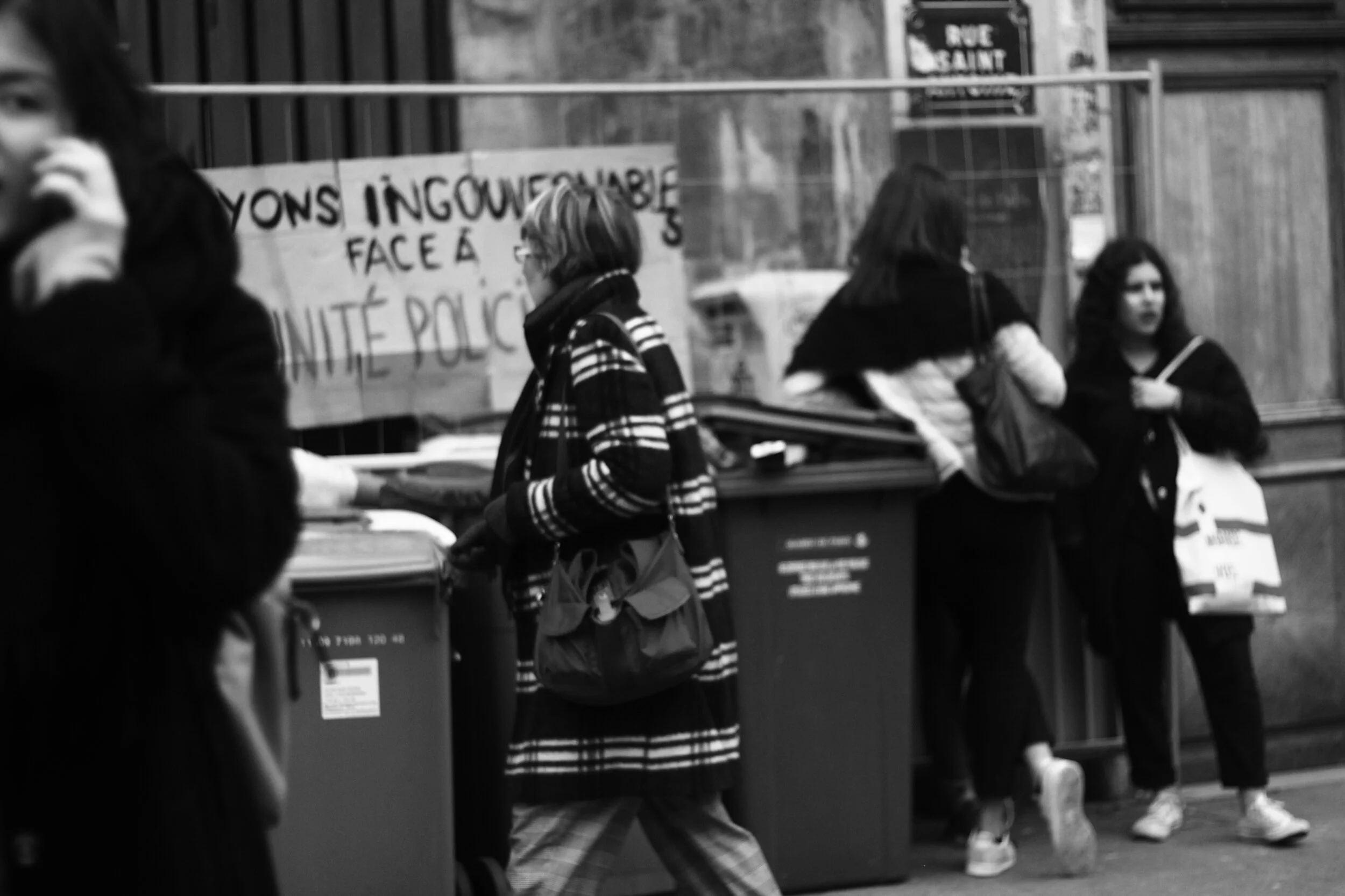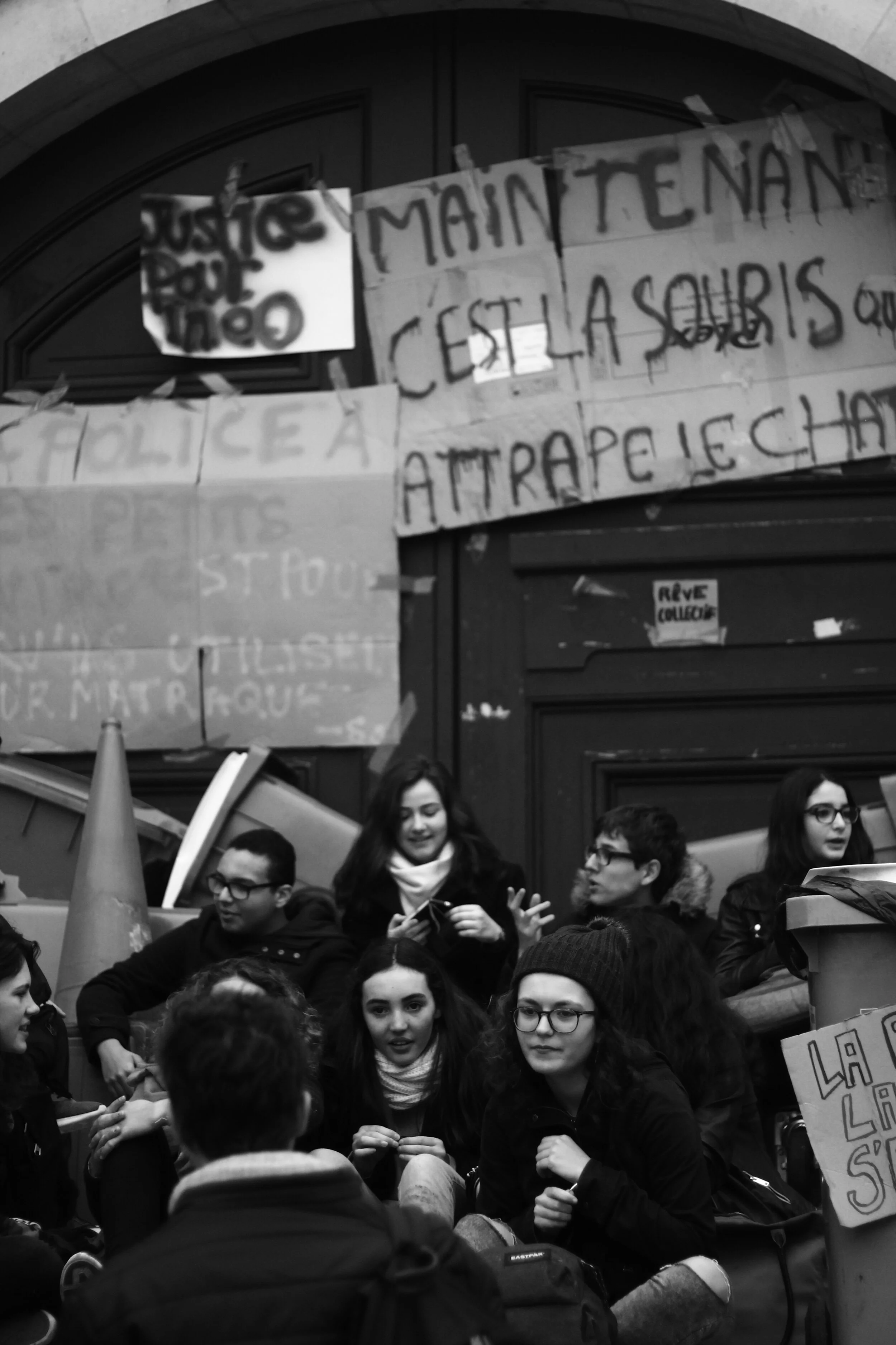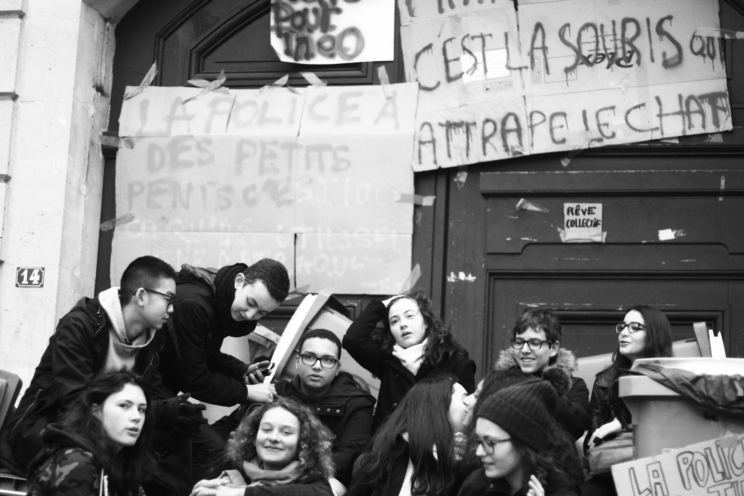 Porte principale du lycée Charlemagne, bloquée par des lycéens. Assis sur des poubelles qui forment une sorte de château, ces derniers répètent : Justice pour Théo. Il est 11:05.