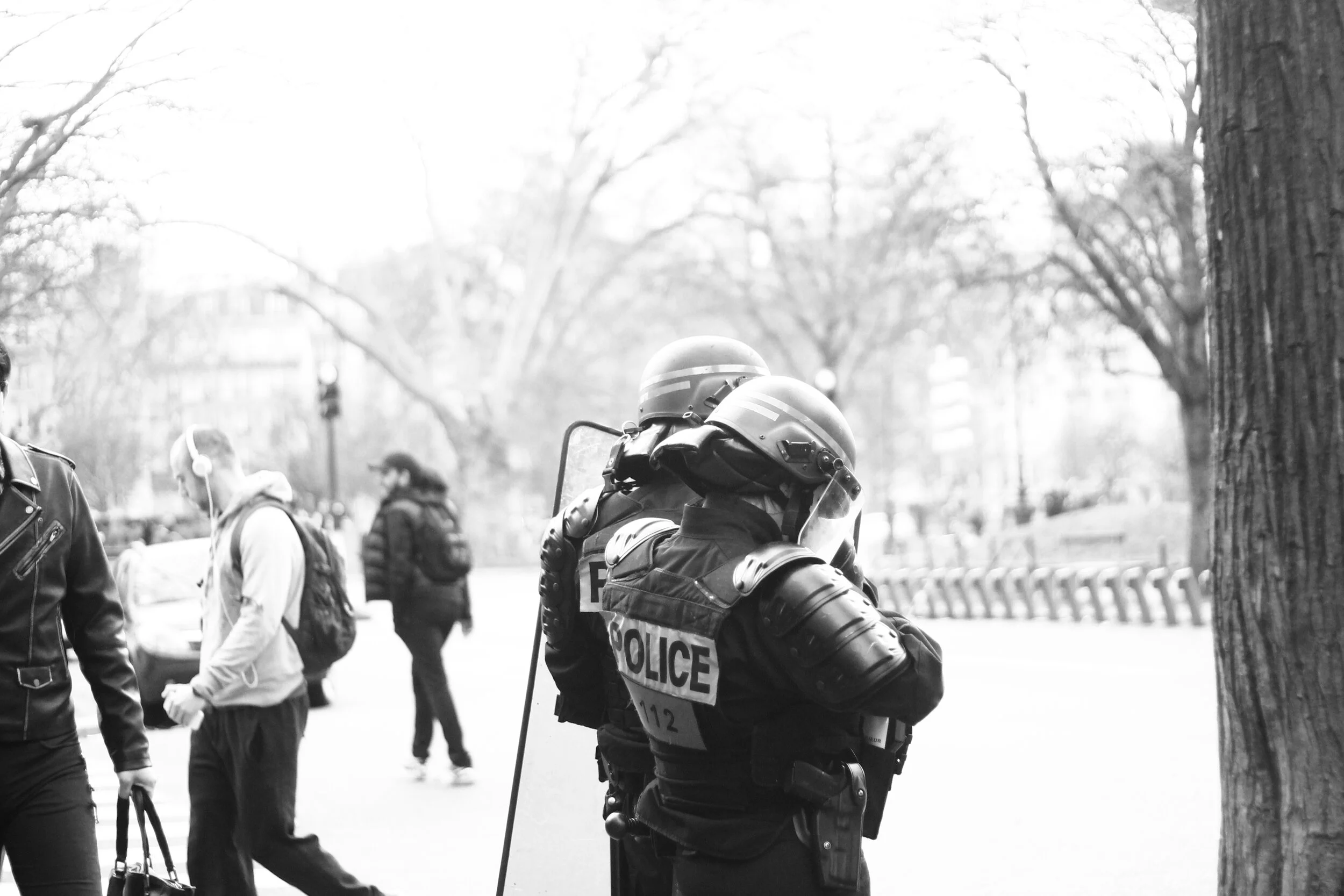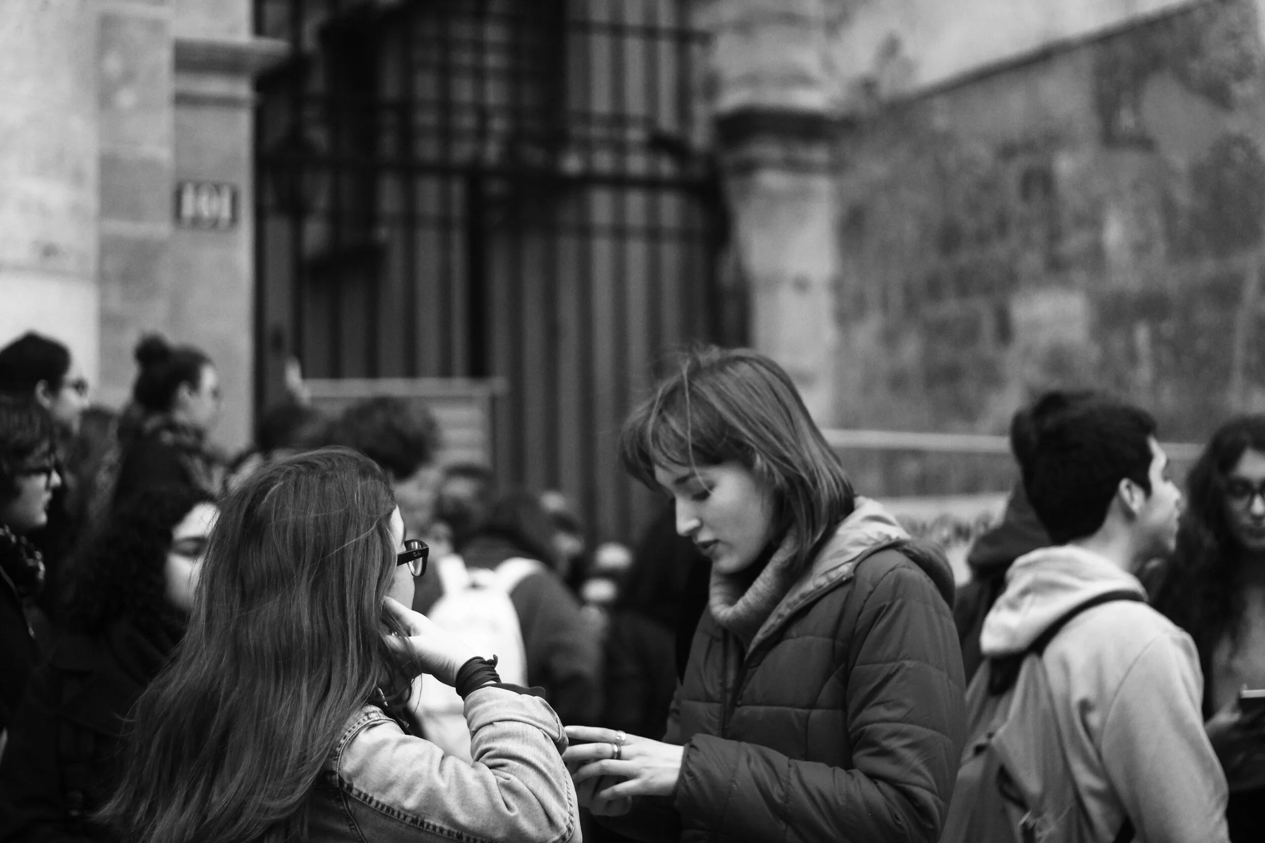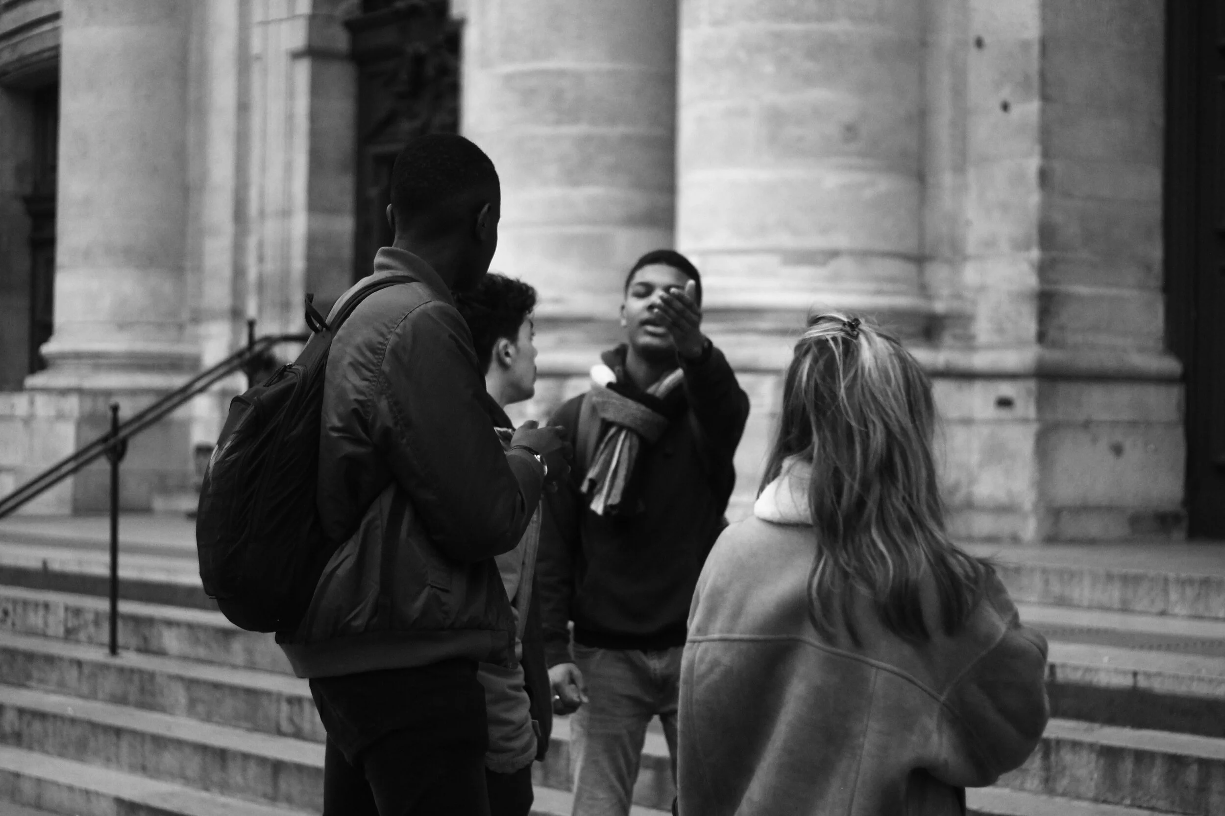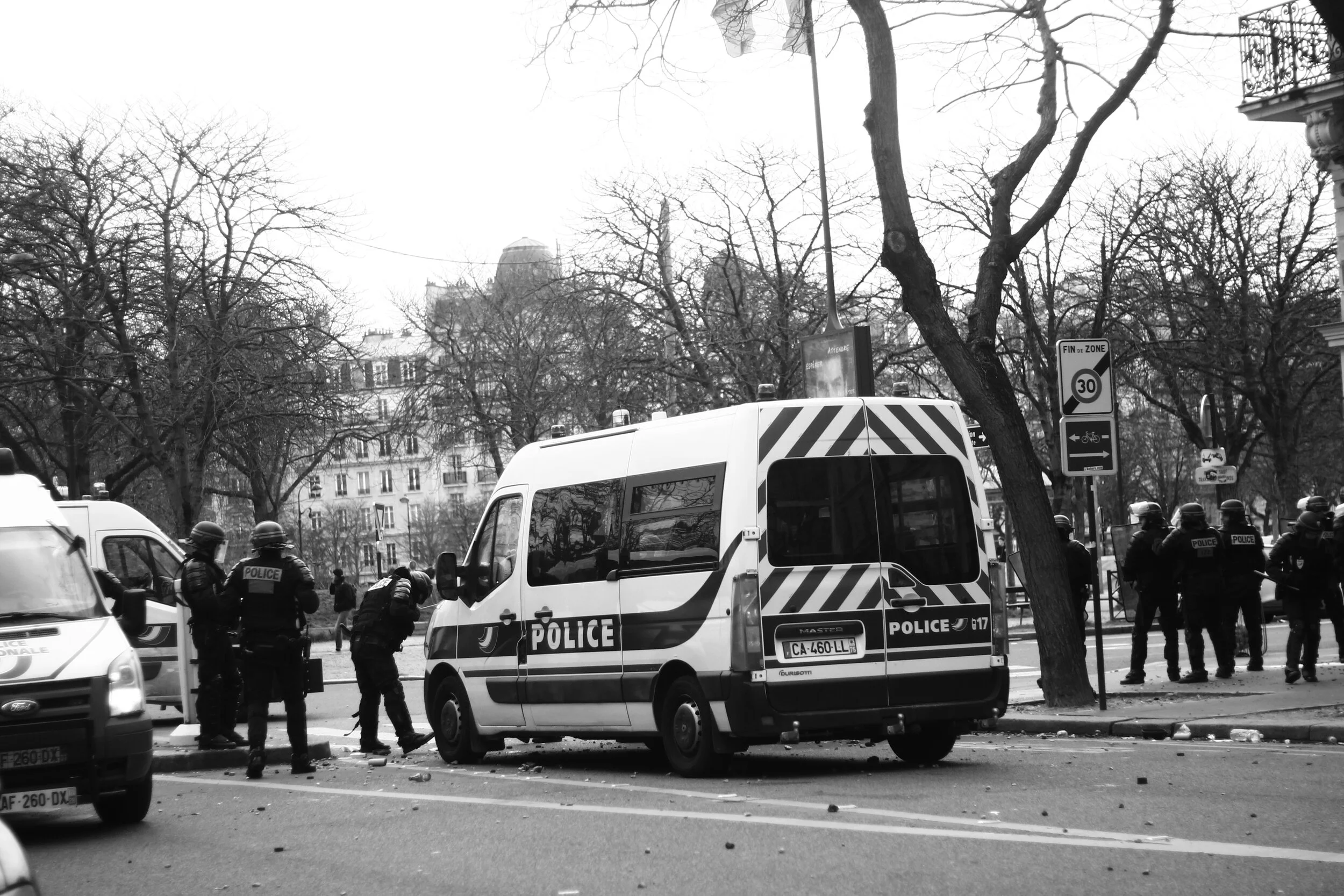 Porte principale du lycée Charlemagne, bloquée par des lycéens. Assis sur des poubelles qui forment une sorte de château, ces derniers répètent : Justice pour Théo. Il est 11:05.